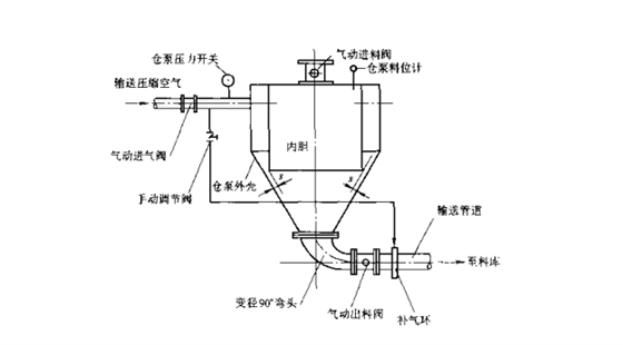 1、当L型仓泵装料到高料位时,仓泵料位计发出输送信号,关闭气动进料阀,开启仓泵气动进气阀。输送用压缩空气被输入仓泵外壳与内胆之间,然后通过仓泵外壳锥体部位于内胆之间的S型间隙向下喷吹,输送压缩空气通过此间隙的流速在20m/s左右,此时一方面使干灰在仓泵锥体部分得到流化,另一方面仓泵内压力迅速提高,当仓泵内压力达到预先设定的开泵压力时,仓泵压力开关输出信号,开启起送出料阀,此时l型仓泵内物料通过变径90°弯头被输送到输送管道内进行栓状流输送。